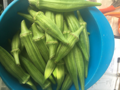 10 pounds of Tomatillos, 30 pounds of Green Beans, 30 pounds of Eggplant, 3 pounds of Okra,