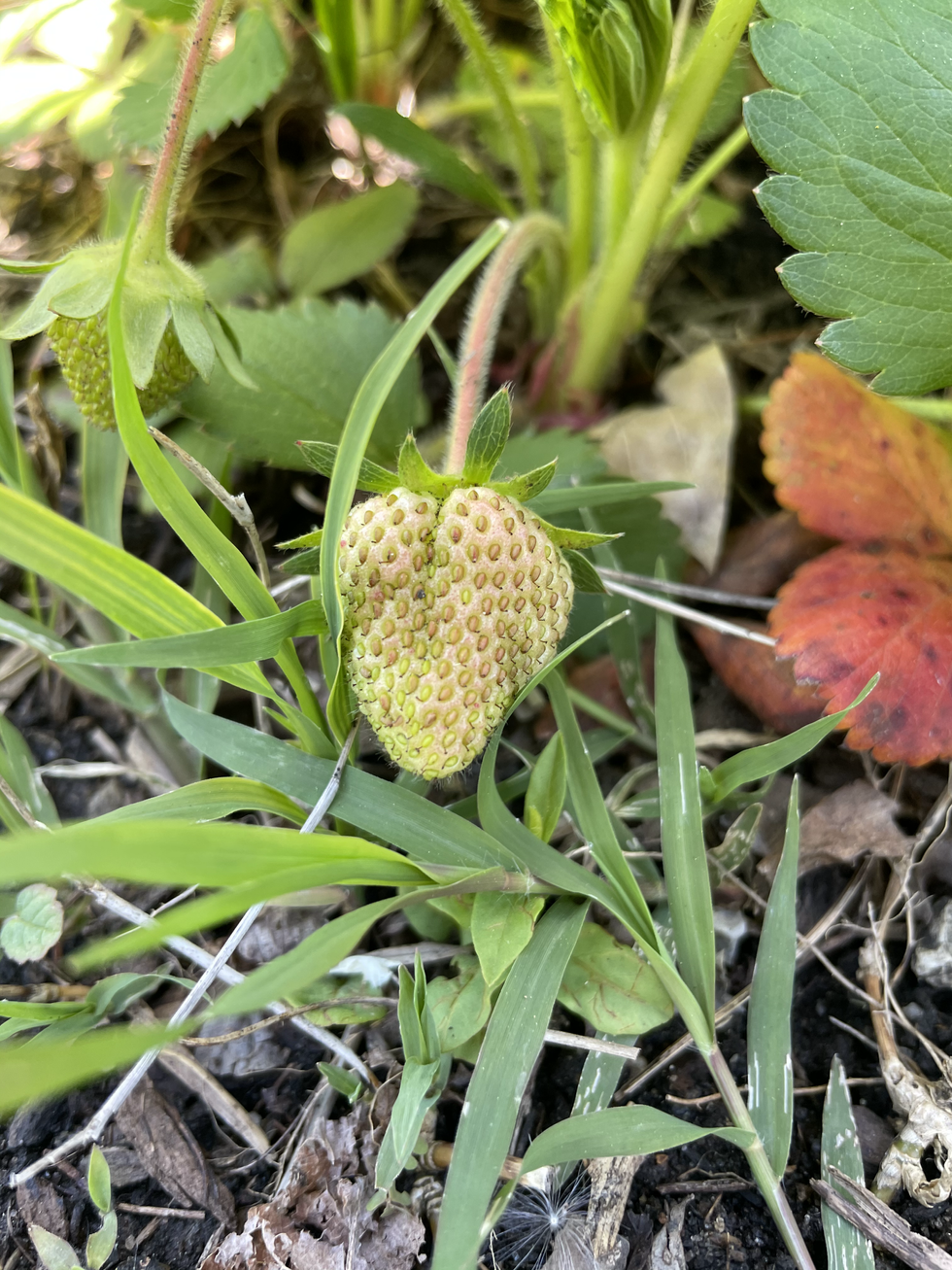 We cover our strawberry beds with a mesh-type fabric which prevents birds, squirrels, and other pests (could never be chickens!) from eating our delicious strawberries either before they are ripe, or before we can harvest them. Our strawberry beds are flowering all over and some strawberries have even begun to form. It will be another week or so before these strawberries ripen and we will be swimming in fruit.